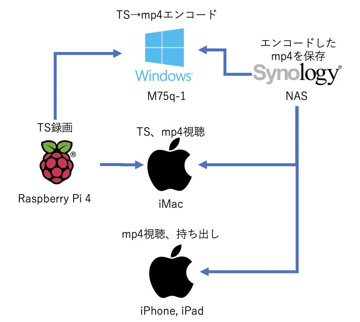 青の矢印は全てSambaによるネットワークマウントです。TSファイルのやりとりはネットワーク帯域を食うので、Raspberry Pi 4、iMac、M75q-1、NAS間は有線LAN接続です。