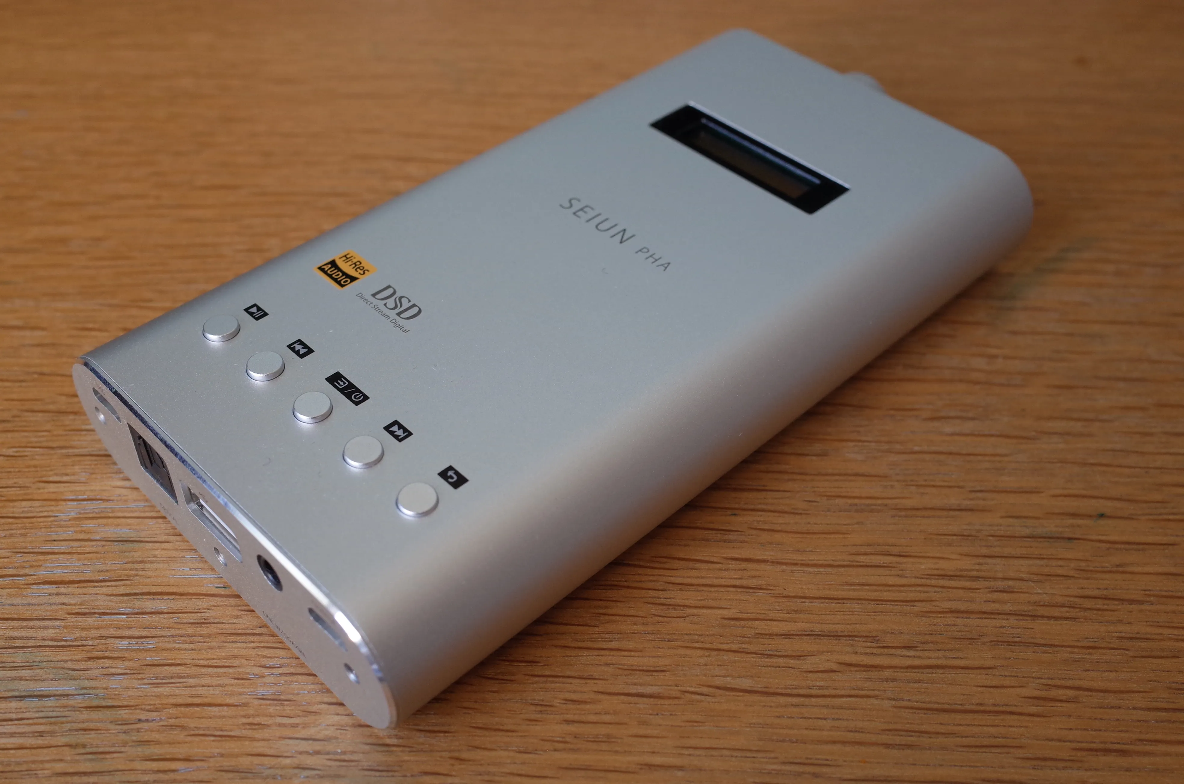 このヘッドフォンアンプの特徴の一つとして、DAP機能を有しています。内部に64GBのストレージを持っているため、PCから音源を転送することでSEIUN PHA単体で再生が可能。その際はこの5つのボタンで操作します。