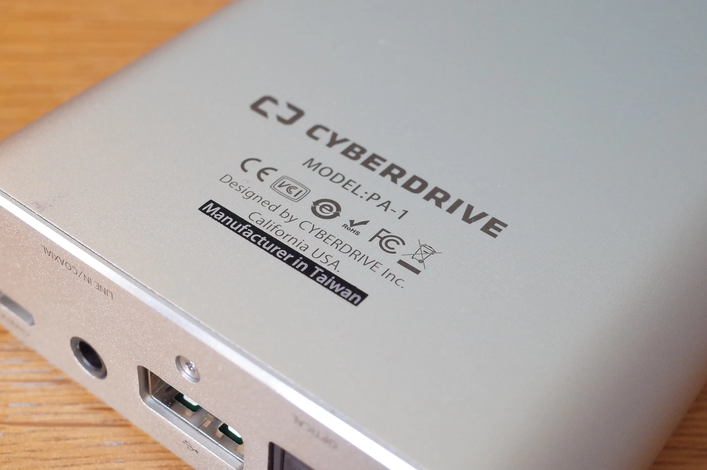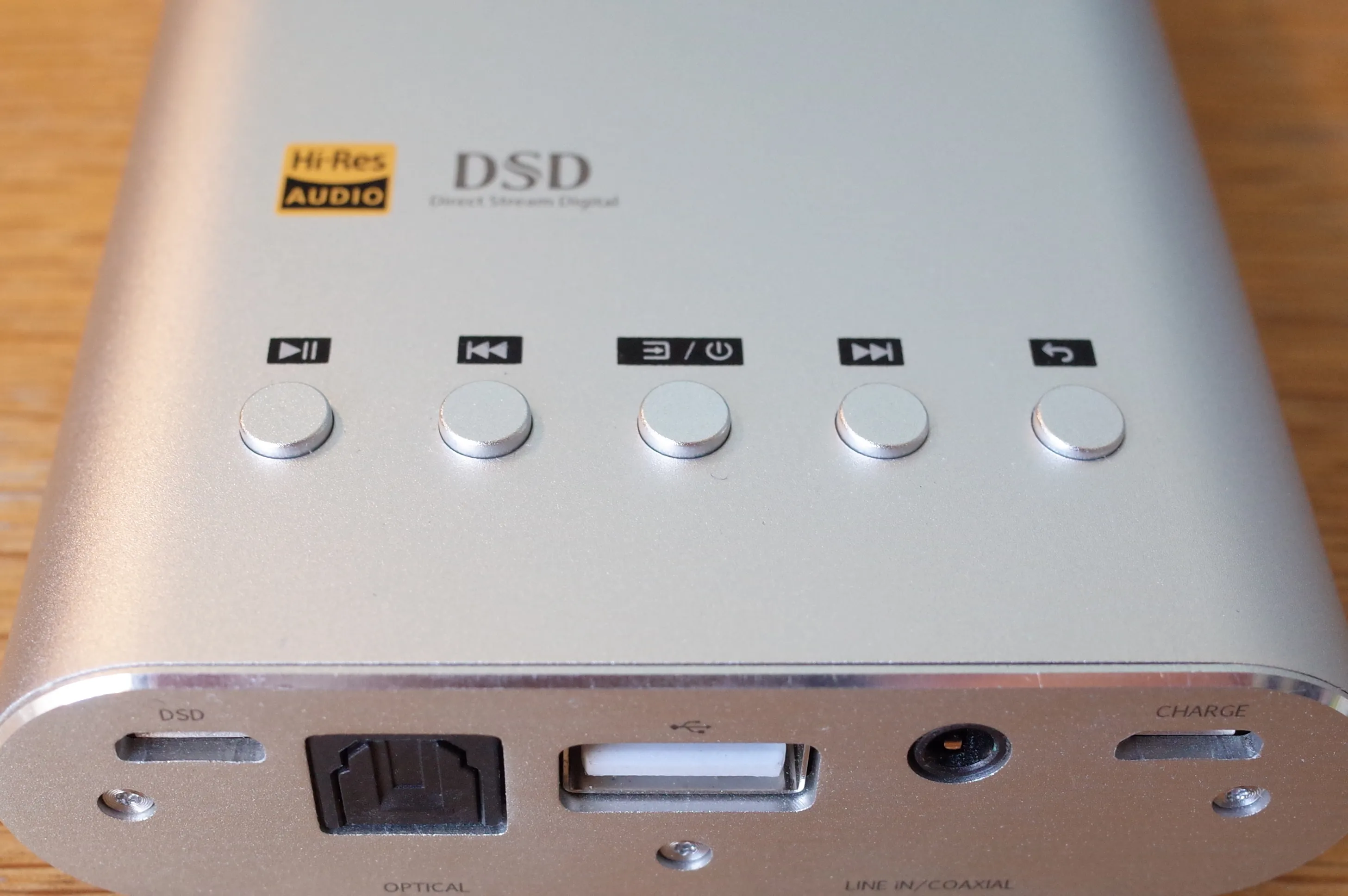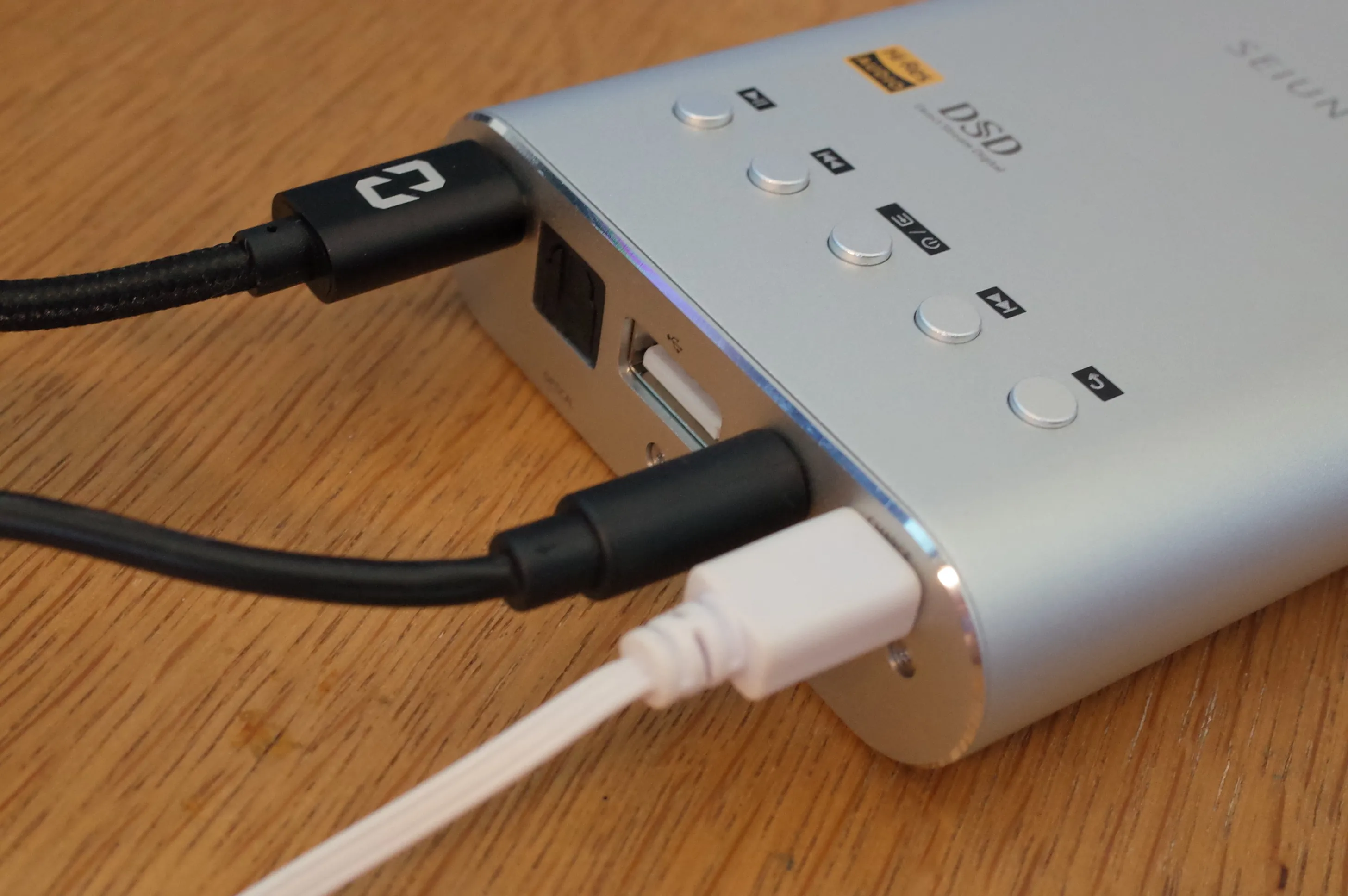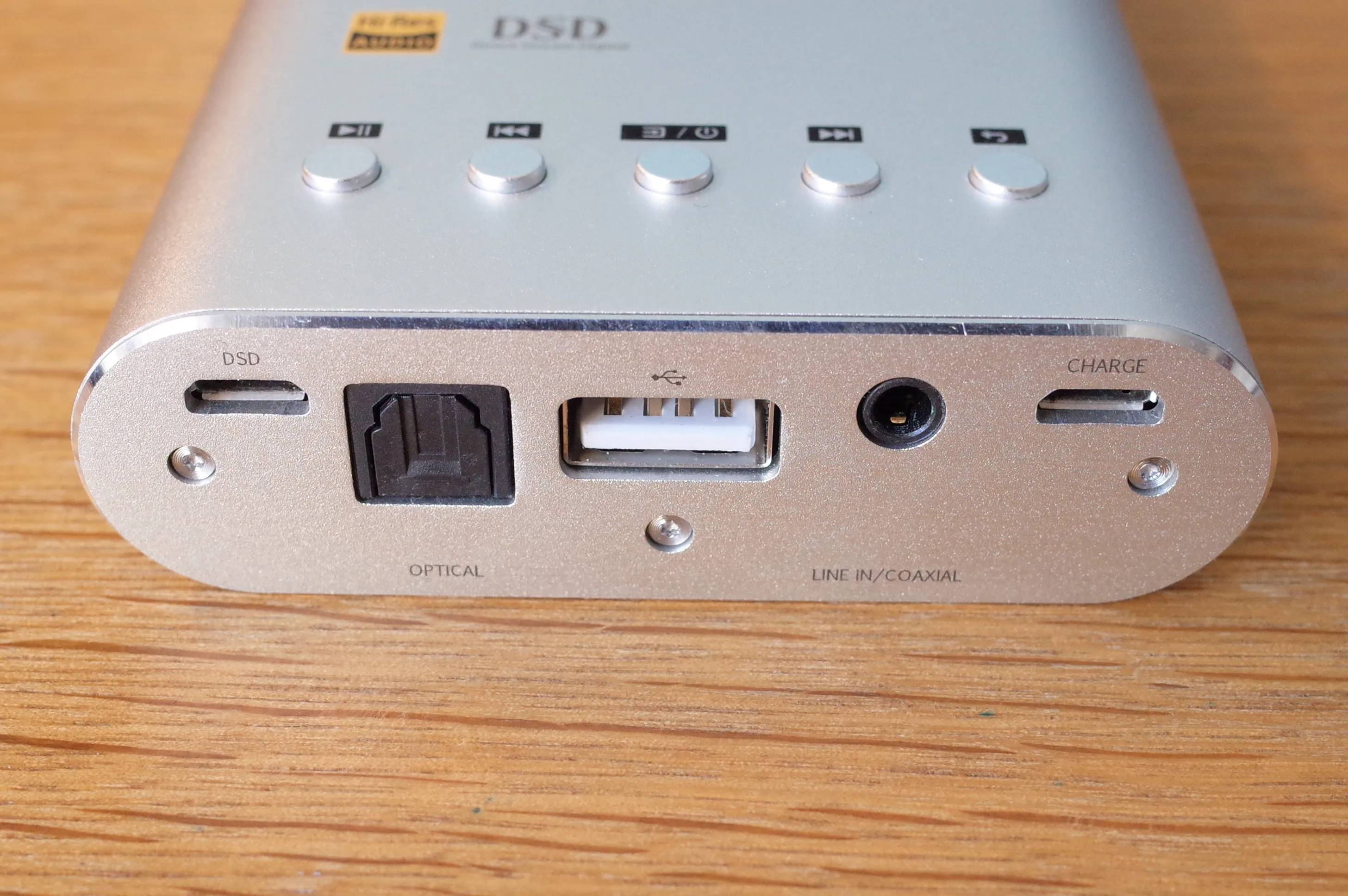 背面。左からUSBデジタルイン、オプティカルイン、USB電源供給、ラインイン/コアキシャルイン、USB充電端子。USBだけで3つある厄介な構造。 笑えるのは、HA-2のように中央のUSB端子を用いてDAPとデジタル接続ができると思いきや、この端子が完全に端末への給電専用となっている点。ただのモバイルバッテリーです。 左側のmicroUSBを使う必要があります。iOSデバイスと接続する際には、microUSB-Lightningホストというレアなケーブルを用意する必要があります。(このケーブル、SEIUN JR-2に付属してたんですよね、CyberDriveさん単品で売ってくれませんか)