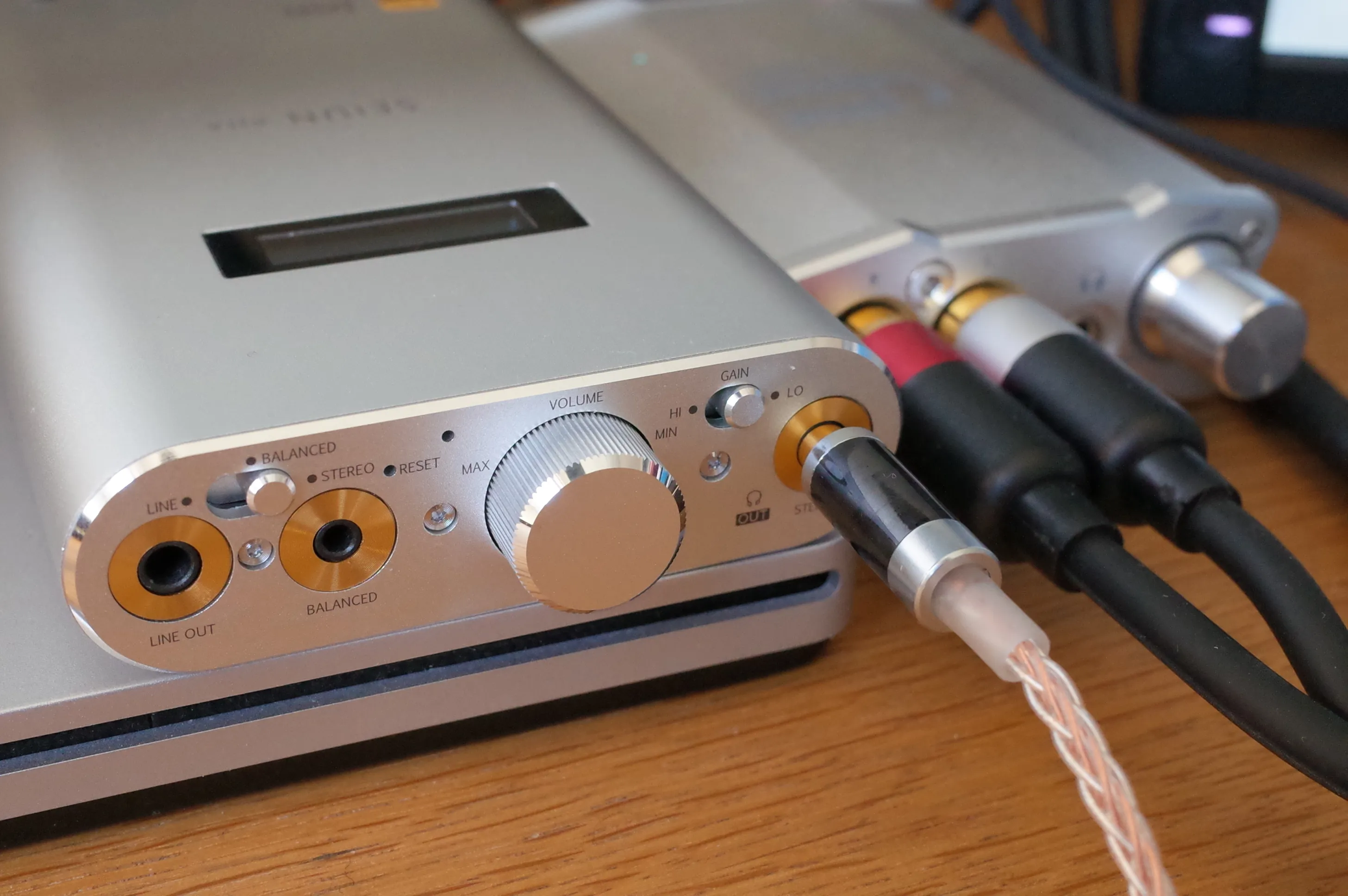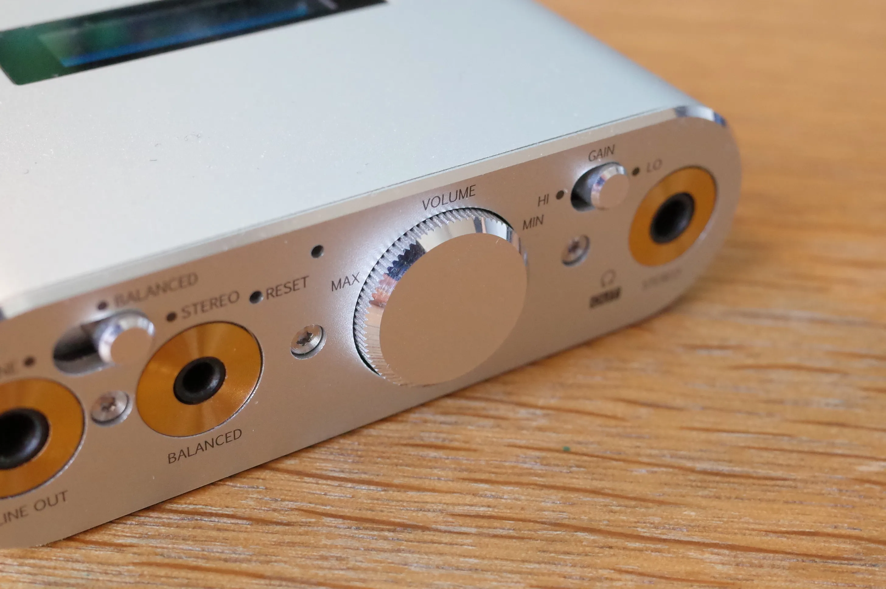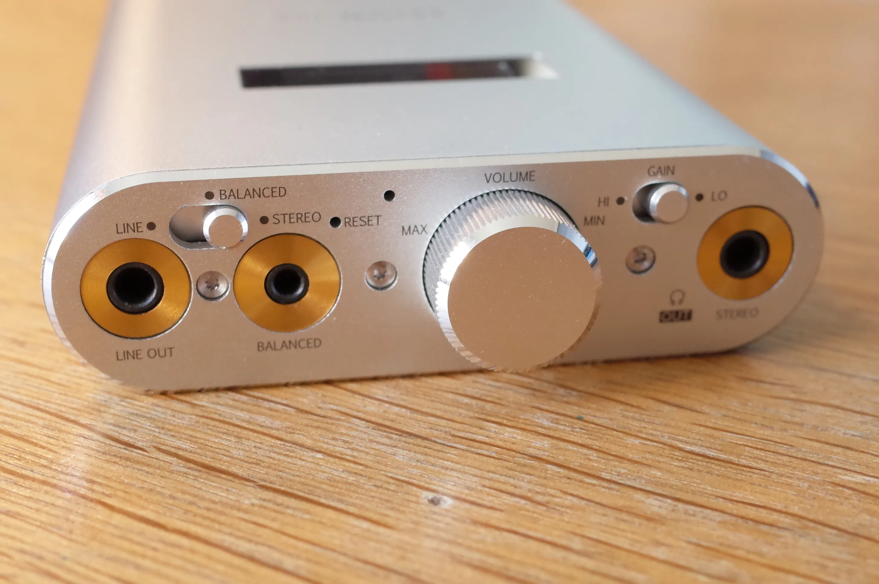 本体正面。左からラインアウト、2.5mmバランスアウト、3.5mmヘッドフォンアウト。2.5mmバランスアウトのアサインが一般的なAKアサインと異なるという誰得仕様です。 向かって左上には出力端子切り替え用スイッチがありますが、3.5mmで聴いているときにラインアウトに切り替えても多少聞こえてきたりと、なんだか怪しい挙動です。