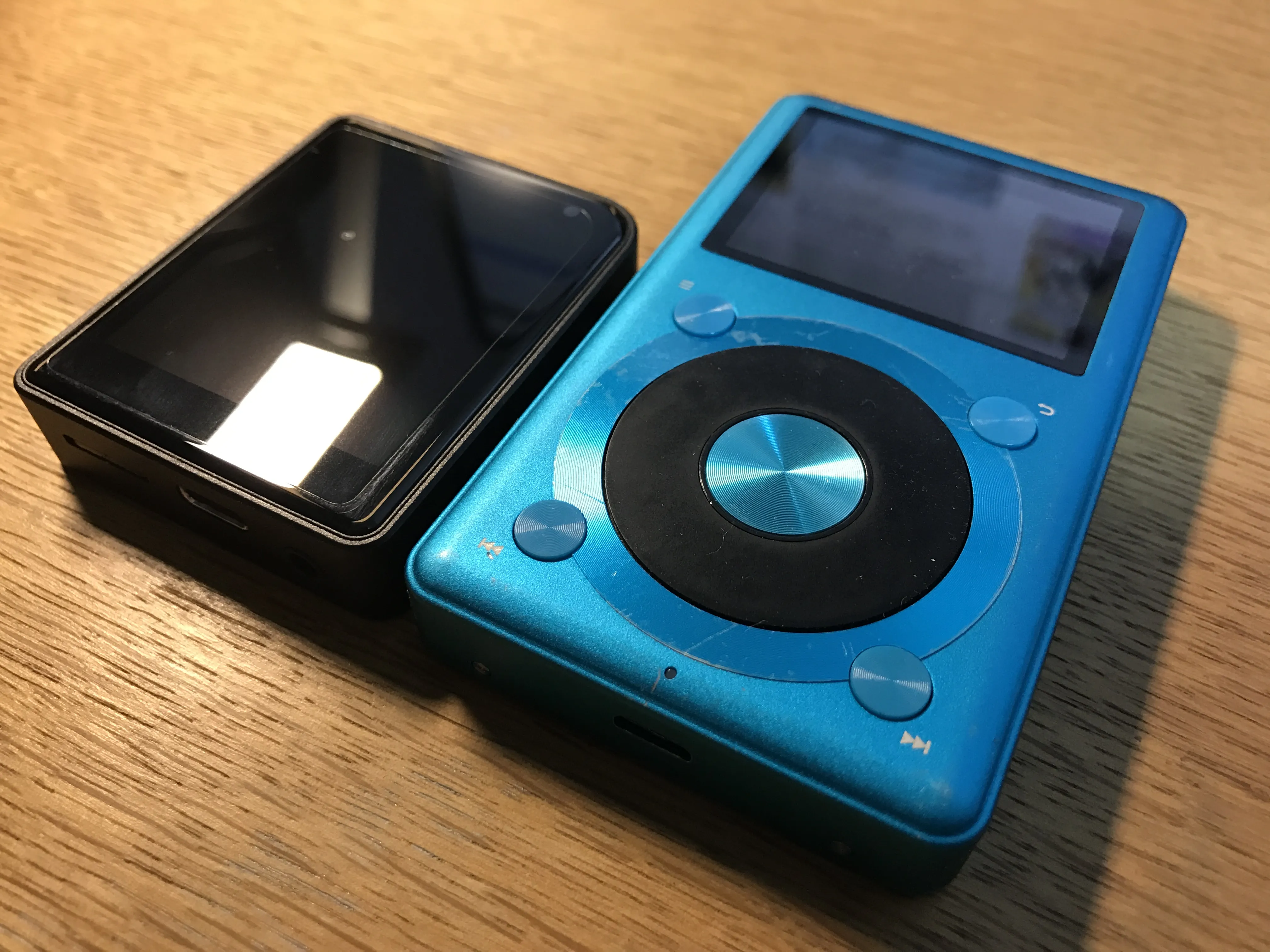 FiiO X1と並べてみると、厚みは同程度ですが高さは半分強と、かなりコンパクトであることが伝わると思います。手のひらにすっぽり収まるサイズで、DAPとはかくあるべきという感じですね。