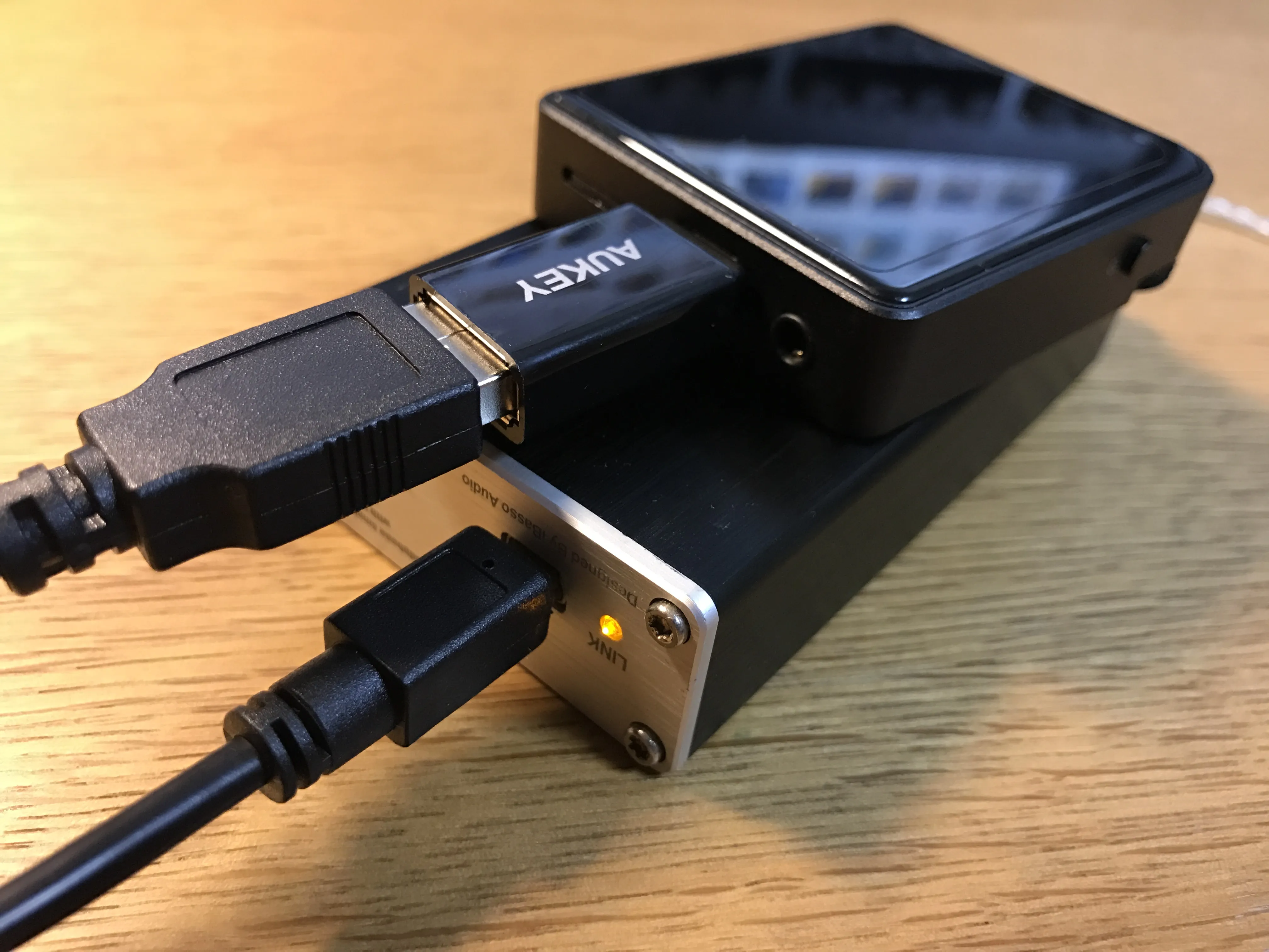 USB OTGケーブルを利用してUSB DACと接続することで、USBデジタル出力を利用できます。デジタル出力が可能なトランスポーターとしてはおそらく最も小さいので、mojoと組み合わせて使用している方も多いようですね。アップデートでDSDのDoP出力にも対応しました。 接続には特に設定などは必要なく、差し込めば簡単にDACを認識してくれます。上の写真はiBasso D55です。接続にはType-C OTG変換コネクタを使用しました。