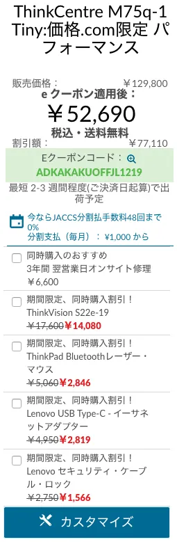 - 「ThinkCentre M75q-1 Tiny:価格.com限定 パフォーマンス」の「カスタマイズ」をクリック。