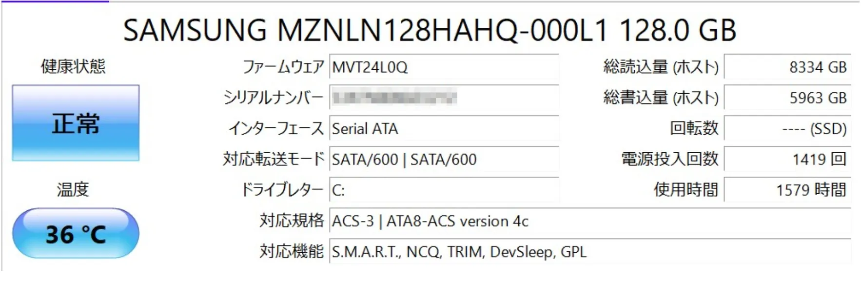 SSDはSAMSUNGのM.2 SATA 128GB。4年使用したPCにしては使用時間1500時間は少ないような。