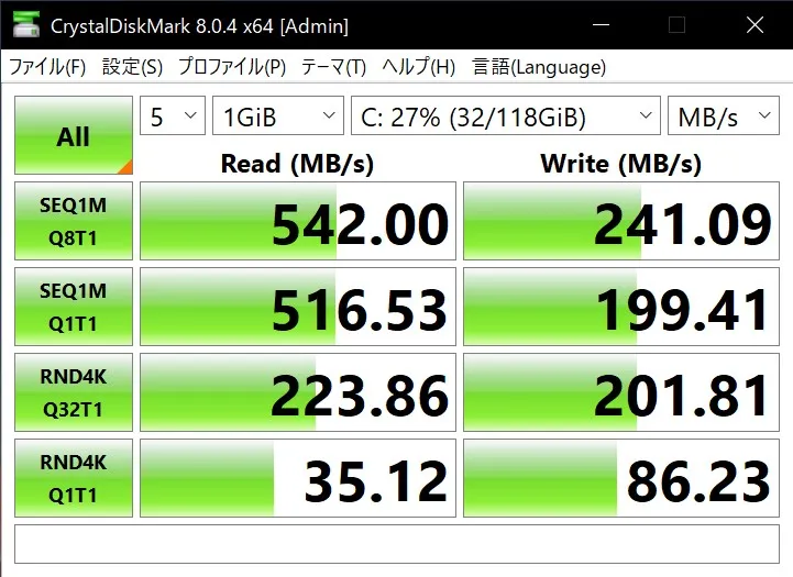 SATA SSDとしてもちょっと遅いですね。書き込みが200MB台は寂しいです。どうやらM.2 NVMe SSDも認識するようなので、気が向いたら分解してみます。