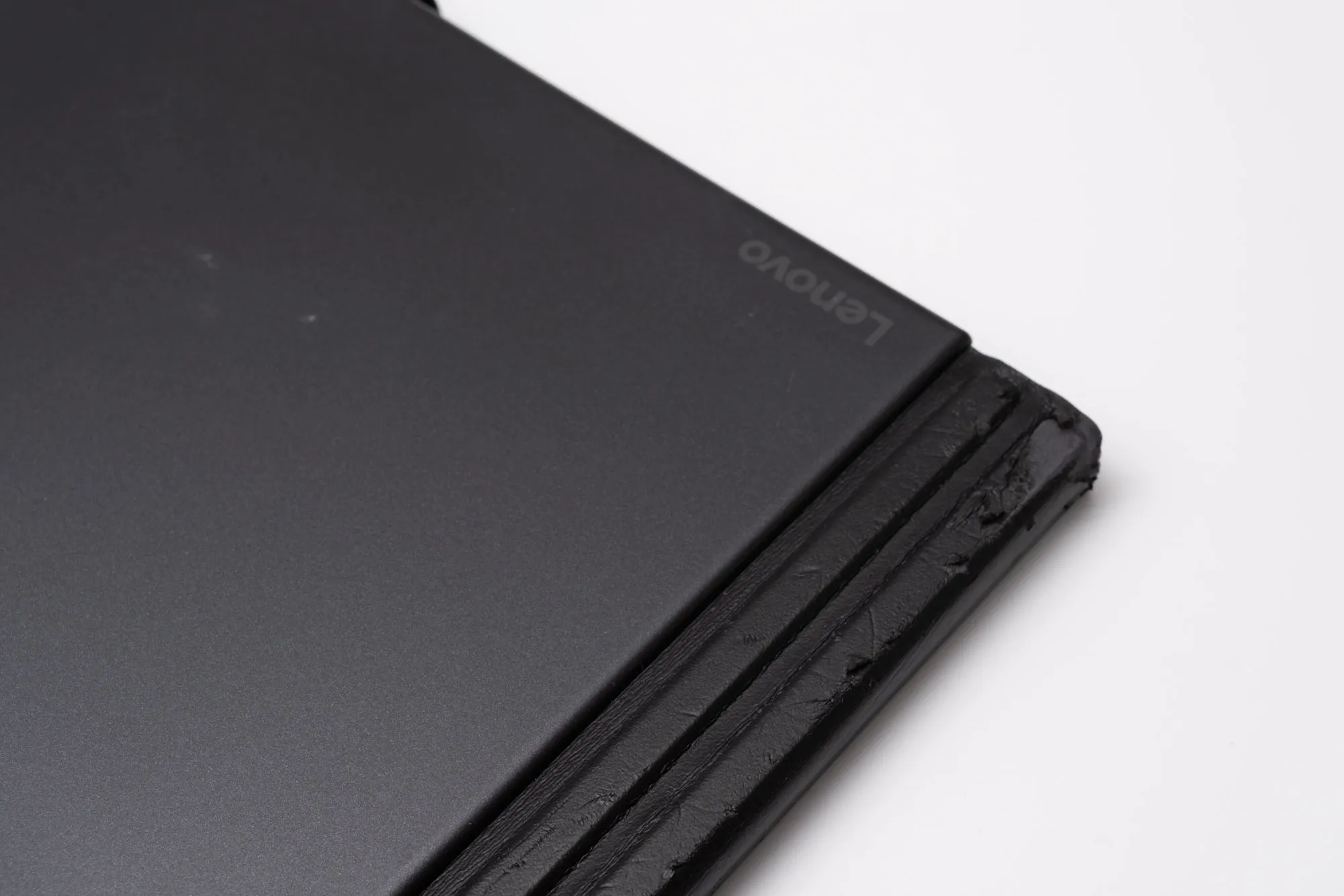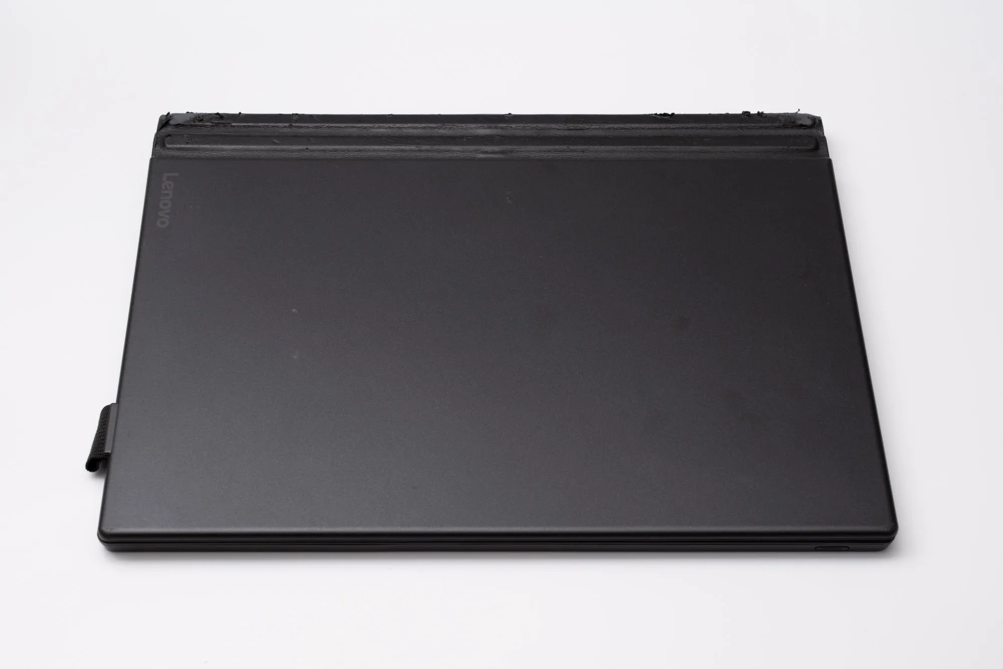 裏面(キーボード側)。薄くLenovoロゴの印刷が入っているのみで、滑り止め脚などもないシンプルで整ったデザインです。