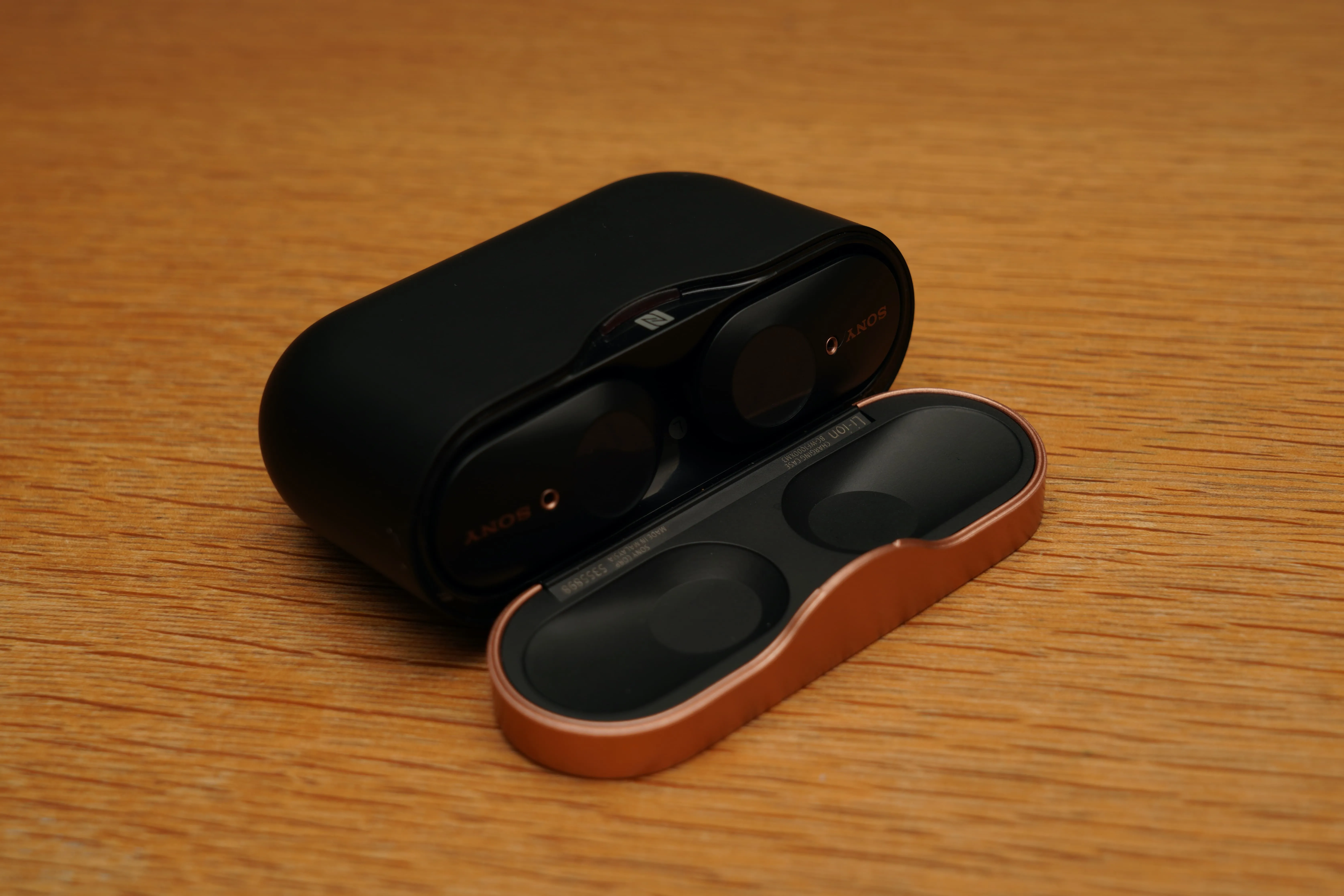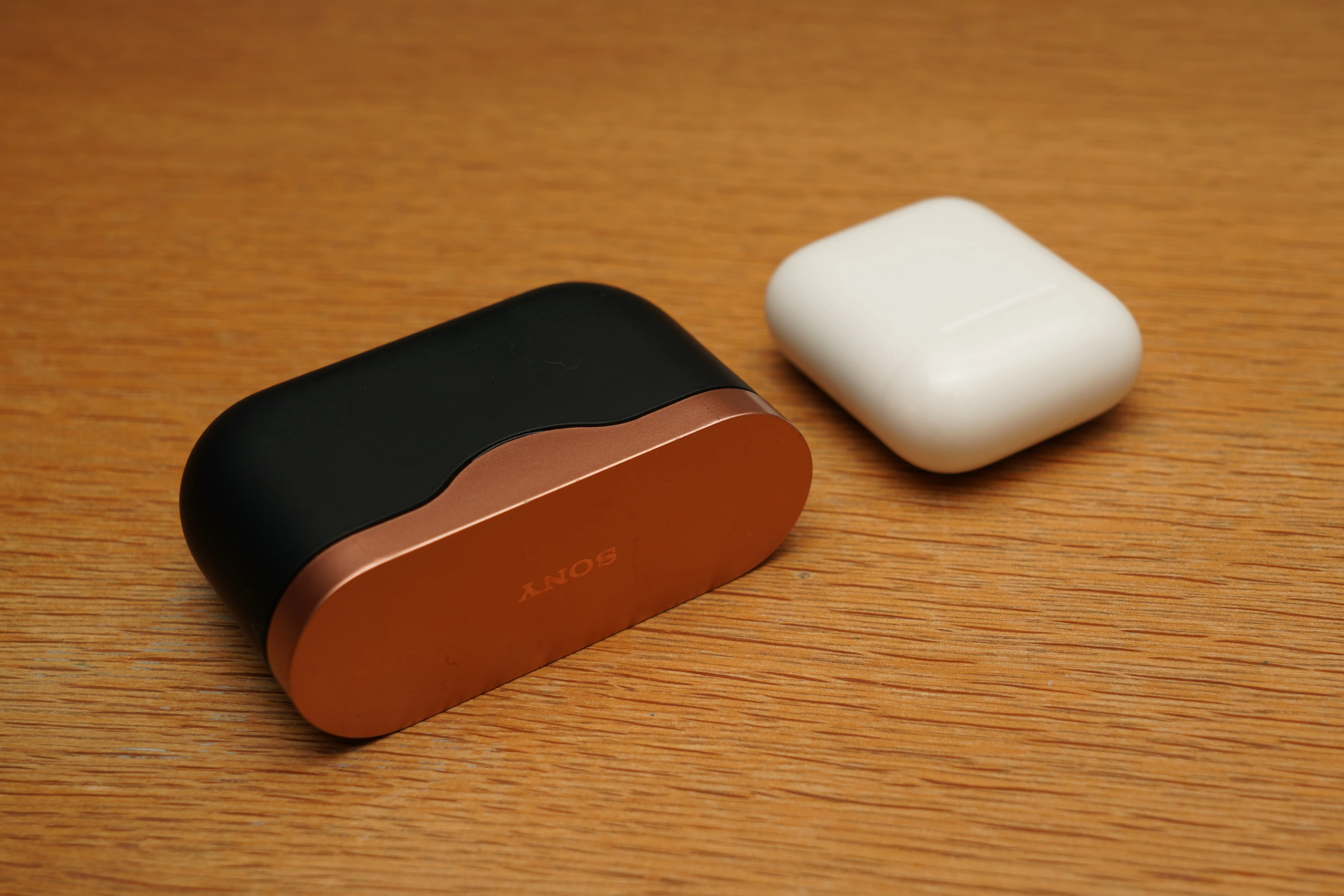 AirPodsのケースと並べてみると分かりますが、とにかくケースがデカい。AirPodsのケースはジーンズのポケットに入れておけますが、WF-1000XM3はちょっと無理。