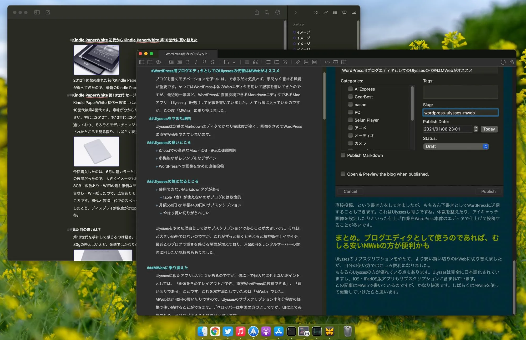 ブログを書くモチベーションを保つには、できるだけ気負わず、手間なく書ける環境が重要です。かつてはWordPress本体のWebエディタを用いて記事を書いてきたのですが、最近約一年ほど、WordPressに直接投稿できるMarkdownエディタであるMacアプリ「Ulysses」を使用して記事を書いていました。とても気に入っていたのですが、この度「MWeb」に乗り換えました。